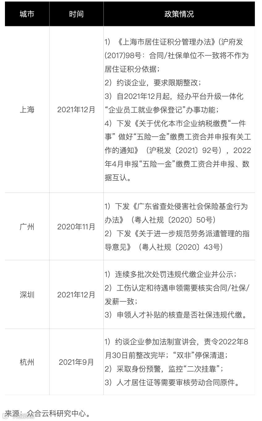 几乎所有城市都或多或少进行参保后防控,针对工伤、医疗等待遇申领环节加以审核限制;部分城市在居住证积分认证环节将合同/社保单位以及社保/个税 基数加以审核限制(如上海);部分城市在人才补贴审核等需要社保/合同单位名称一致(如深圳);部分城市在子女入学等需要社保/合同单位名称一致 (如北京)等。