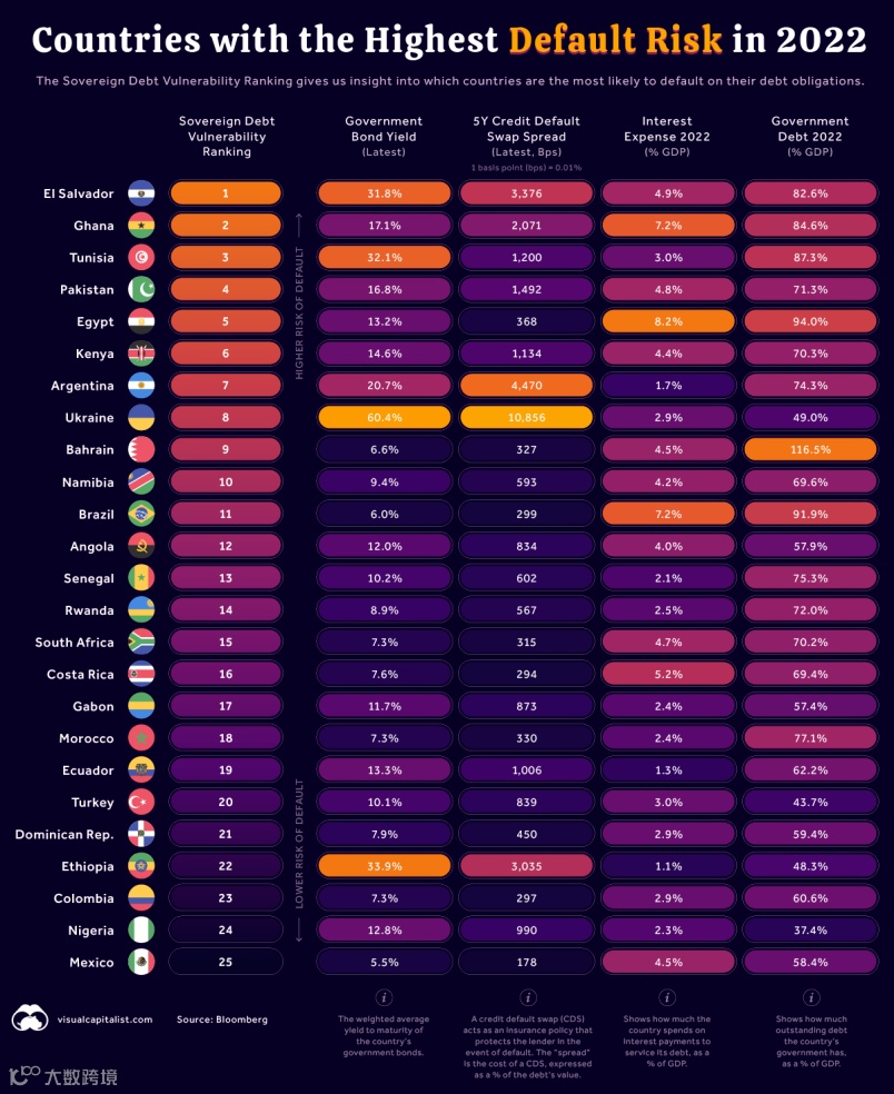 国外数据网站visual capitalist引用彭博社的数据,对违约风险最高的国家进行排名,如图: