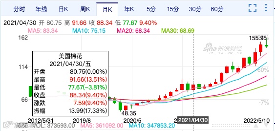 自去年4月以来,国际棉花期货价格已经上涨了一倍,纽约棉花期货一度涨至约158美分/镑,不断刷新2011年5月以来的新高。