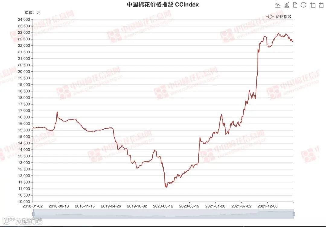 从价格来看,虽有外盘强势带动,但今年以来,国内棉花期货价格保持稳定。5月12日,中国棉花价格指数为22313元/吨,较2021年底仅增长1%,内外棉价倒挂超千元。