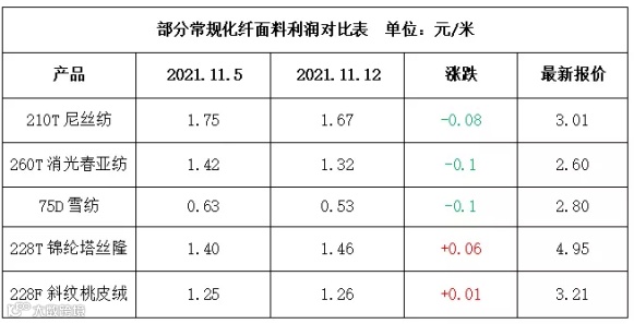 据调研,目前市场上坯布价格几乎都有不同程度的下跌,常规基本在0.02-0.05元/米,也有个别品种跌幅较大。虽然从跌幅看,常规品种的降幅并不多,且涤纶长丝也有所下降,似乎仍有利润空间可言。但实际情况并不是,由于前期涨幅较大,织造厂家又重拾“买涨”心态,在10月份涤丝刚上涨时囤了不少原料。以至于到目前,前期高价原料还未消耗完,坯布价格就已经下跌,因此利润是受影响的。