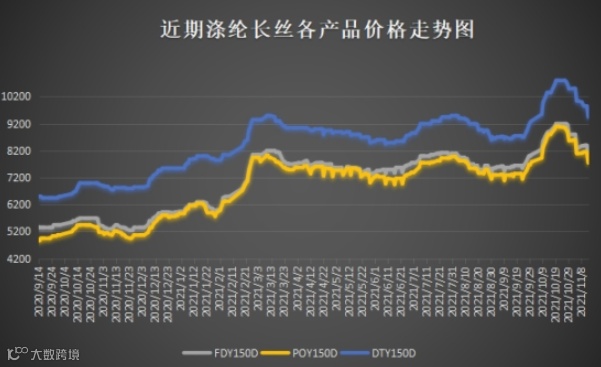 “限电限产”让纺织全产业链措手不及,产能降低、原料价格上涨、缺货断货等现象从原料端到需求端均有体现。进入11月,虽然部分情况有所改善,但纺织市场似乎陷入了比10月更加纠结的地步。近日,纺织大宗商品的价格出现波动。原料价格的波动向下传导,15日各大聚酯厂家再次迎来大促销,大跌200-600元/吨。截至11月15日涤丝各产品价格对比上月即今年最高值,涤纶长丝FDY150D下跌1250元/吨至7950元/吨,POY150D下跌1350元/吨至7750元/吨,DTY150D下跌1350元/吨至9450元/吨。