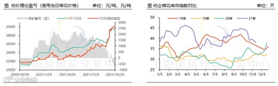 十月以来,棉纺现货市场与期货市场走出了一个完全不同的境况。期货方面,郑棉一路走高,最高涨至22960元/吨,创近十年高点;而棉纱最高竟达到30510元/吨,创上市来新高。但棉纺市场却在“金九银十”传统旺季则一直表现不温不火,与市场预期差距较大。甚至在期货持续上涨以来,反而走势渐淡。花纱现货价格方面跟随期货也有2000元以上的上涨,但市场成交却没有遵循“买涨不买跌”的趋势呈现。一来下游织厂对大涨的原料抵触情绪较大,二来多地仍实施“双控”政策,纺企、织厂开机率均较低,需求难以改善,因此多按需采购。一些纺企反应已经很久没有新订单了,最多的甚至有20天没有接到订单。据了解,目前纱价若按纺纱周期20日前棉花原料价格来算还尚有利润,但以当前盘面来算,基本处于亏损状态。纺企棉花原料库存依然处近4年最高,约在35天左右。