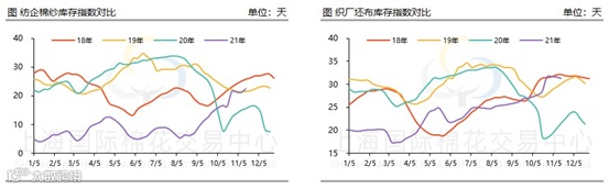 当前纯棉纱市场依然较为惨淡,纺企成品库存也逐渐累积至2018年高位。截至10月29日,纺企棉纱成品库存日均在22.5天左右。规模性大厂在十月底基本前期订单接近尾声,库存在15天左右,中小纱厂普遍在20天左右,部分纱厂库存甚至已经有30天的库存。归根究底还是下游的需求出现了问题。进入黄金9月后,织厂订单只维系在11-12天上下,远逊于疫情的2020年和贸易战的2019年,而同时下游棉布织厂的成品库存也在往年同期高位了。据了解,纺企及布厂对后市无法表示出乐观。同时,织厂订单在7-8月却呈现淡季不淡的特征,当前订单较少有部分原因就是,因疫情导致的全球供需错配和物流阻隔导致的订单前移,随着海外印度,越南等传统纺织加工基地的复产复工,也会分流走一波潜在的需求。