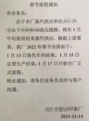 纺织一旦热电厂明确停汽时间,那必然意味着将有多家染厂在同一个时间段集中停产放假。目前也已有印染厂发布春节放假通知,跟随蒸汽供应正式放假。