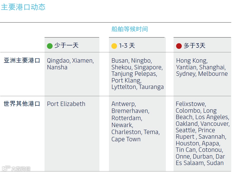 根据马士基最新的亚太区供应链市场趋势报告(2021年11月),全球主要港口动态如下表: