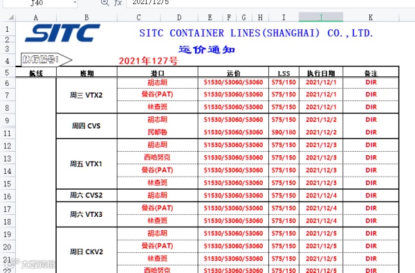 船东海丰国际12月初东南亚航线执行运价