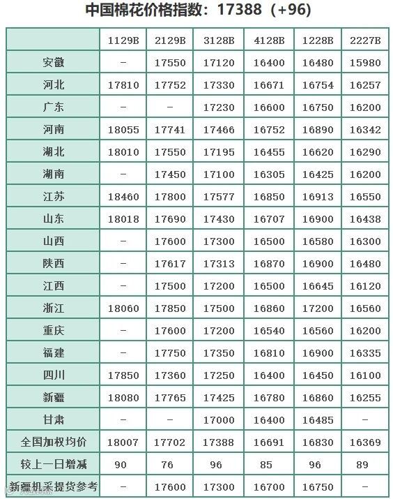 中国棉花价格指数发布三个代表品种CC Index3128B、CC Index2129B、CC Index2227B,分别代表国内棉花现货的“高、中、低”等级的实际到厂成交价。其中CC Index3128B是白棉3级、长度28毫米、马克隆值B级代表标准级(中等级)棉花;CC Index2129B为白棉2级、长度29毫米、马克隆值B级,代表高等级的棉花;CC Index2227B为淡点污棉2级、长度27毫米、马克隆值B级,代表低等级的棉花。发布三个代表品种的同时还发布1129B、1228B、4128B的价格以及分省数据。新标准下中国棉花价格指数发布的价格,除颜色级、长度级和马克隆值级外,其它指标限定为长度整齐度中等、断裂比强度中等、轧工质量中等、异性纤维含量低。