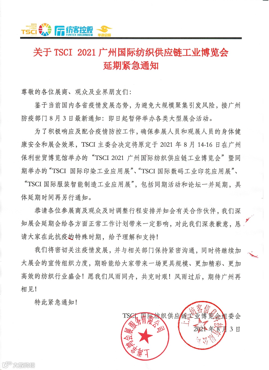 紧急通知!!!关于TSCI 2021广州国际纺织供应链工业博览会延期通知