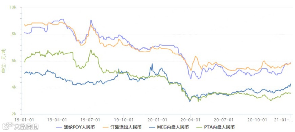 图3 2019~2020年涤纶及其原料价格走势图