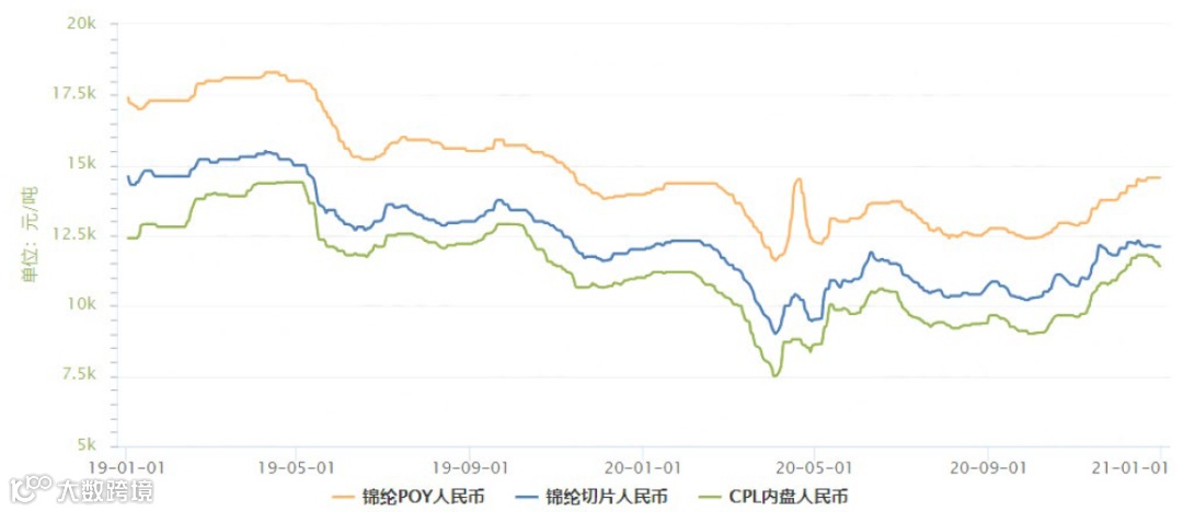 图4 2019~2020年月锦纶及其原料价格走势图