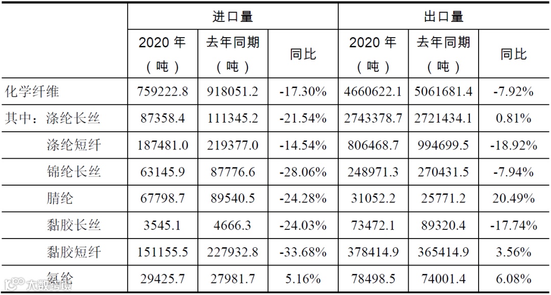 表2 2020年化纤主要产品进出口情况