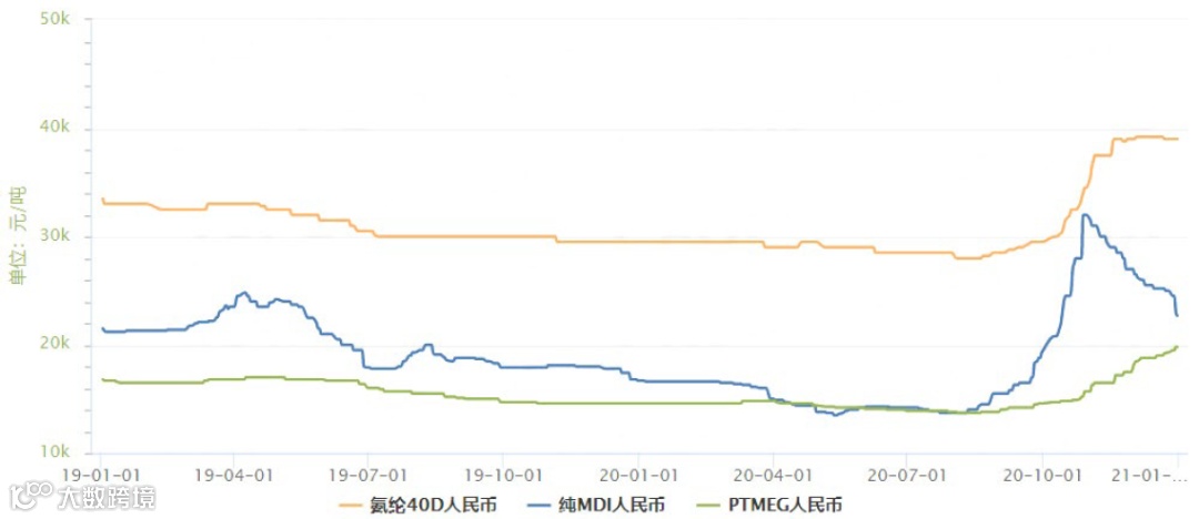 图6 2019~2020年氨纶及其原料价格走势图
