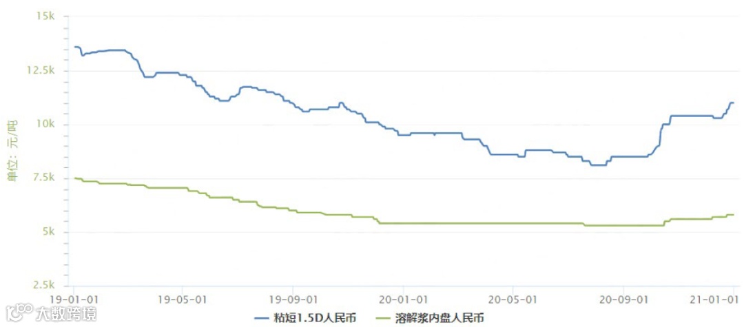 图7 2019~2020年黏胶短纤及其原料价格走势图