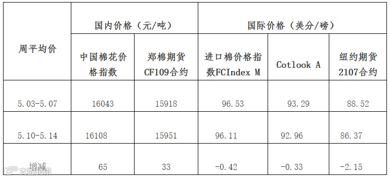 上周(5月10日-14日),国内外棉价以下跌为主,持续上涨的大宗商品市场价格引发投资者政策收紧预期,尽管受周三美国农业部5月供需报告中全球棉花供应数据偏紧影响,国内外棉价一度短暂冲高,但之后再次回落。上周中国棉花价格指数CC Index(3128B)周均价为16108元/吨,环比上涨65元;Cotlook A指数周均价为92.96美分/磅,环比下跌0.33美分,1%关税下折人民币14875元/吨,较中国棉花价格指数CC Index(3128B)低1233元,价差较前一周扩大117元;郑州商品交易所棉花主力合约CF109周均价15951元/吨,环比上涨33元;ICE棉花期货近期合约周均价为86.37美分/磅,环比下跌2.15美分。