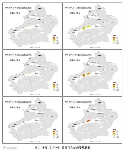 根据未来7天5*5KM格点天气预报,结合棉花立枯病发生等级气象指标,预计5月16~18日塔城南部、石河子市的局部棉区以及16~21日阿克苏地区部分棉区可能出现不同程度棉花立枯病(分布区域见图1)。