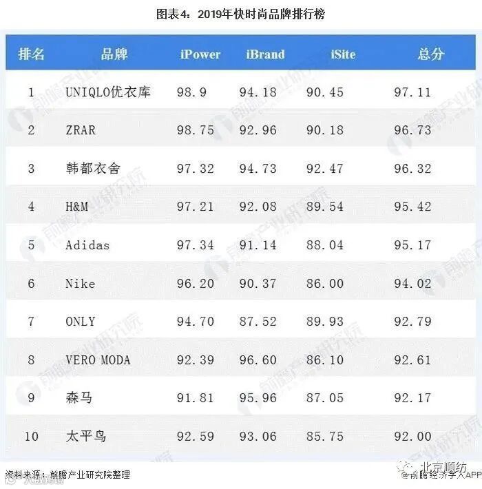 2019年4月,《互联网周刊》和eNet研究院联合发布2019快时尚品牌排行榜。该榜单统计了150个快消品时尚品牌,其中优衣库、ZARA和韩都衣舍位列前三,在前十的排名里,后七位分别是H&M、Adidas、Nike、ONLY、VERO MODA、森马和太平鸟。