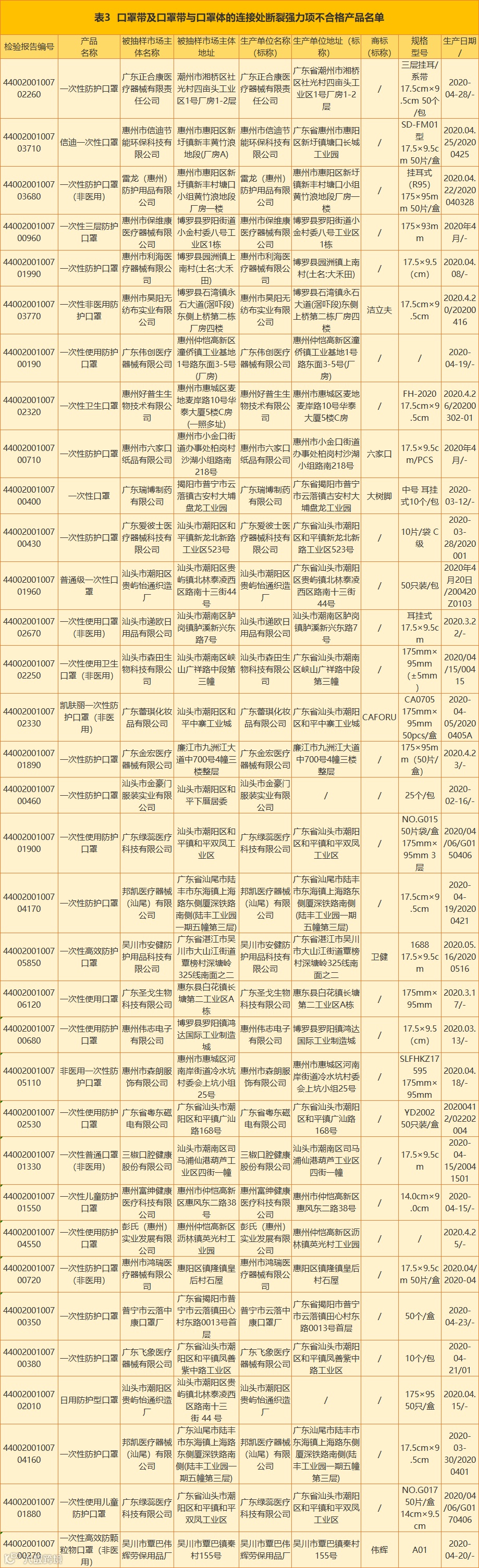 3.郑州圣意得服饰有限公司生产的1批次一次性使用口罩,过滤效率(盐性介质)实测最低值86.4%,标准要求≥90%,过滤效率(油性介质)实测最低值68.1%,标准要求≥80%;防护效果实测最低值40%,标准要求≥65%。