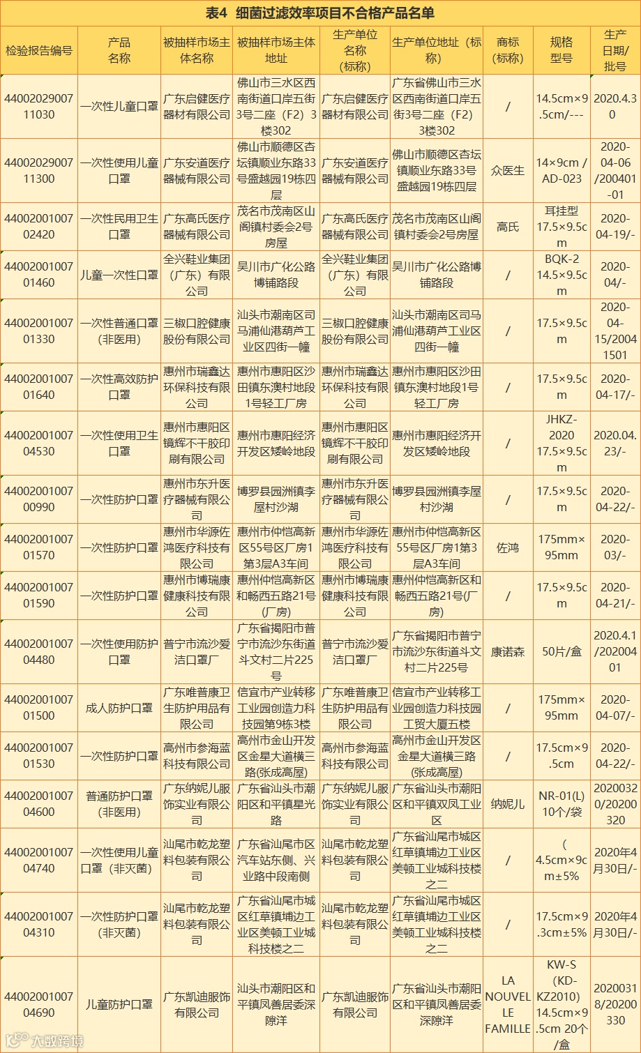4.河南凯昌服装有限公司生产的1批次一次性防护口罩,过滤效率(盐性介质)实测最低值84.4%,标准要求≥90%,过滤效率(油性介质)实测最低值64.1%,标准要求≥80%;防护效果实测最低值42%,标准要求≥65%。