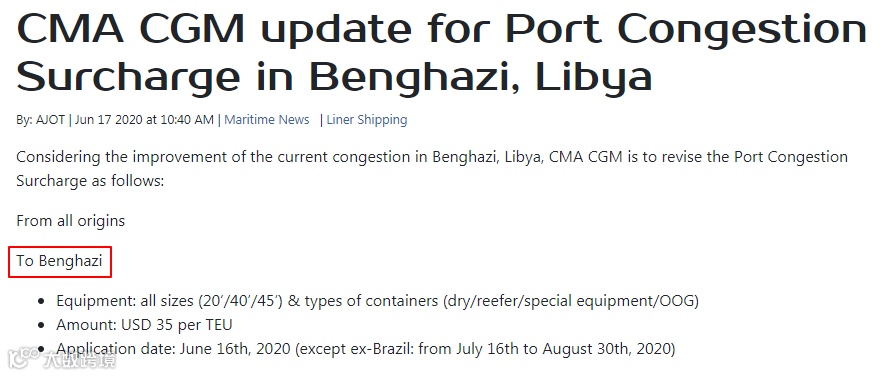 考虑到利比亚班加西当前交通拥堵的改善,达飞轮船将修改港口拥堵附加费。