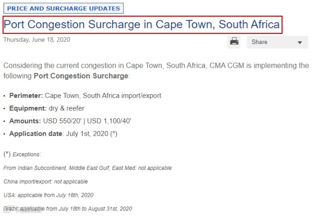6月18日,CMA CGM宣布,开普敦将对干货集装箱和冷藏集装箱收取每20尺柜550美元和每40尺柜1100美元的拥堵费,7月1日生效。