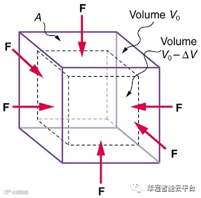 对弹性体施加一个整体的压强p,这个压强称为体积应力,弹性体的体积减少量(-dV)除以原来的体积V称为体积应变,体积应力除以体积应变就等于体积模量:K=P/(-dV/V)