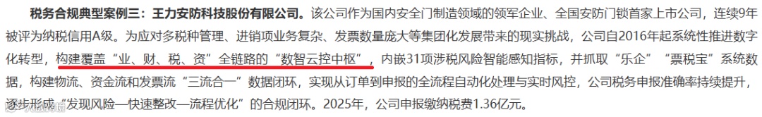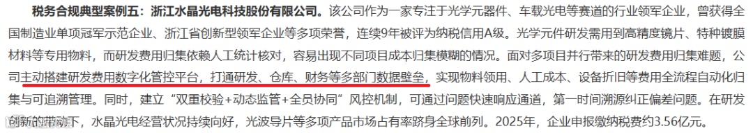 王力安防构建了覆盖“业、财、税、资”全链路的“数智云控中枢”,实现了从订单到申报的全流程自动化处理;水晶光电搭建了研发费用数字化管控平台,打通了研发、仓库、财务的数据壁垒。
