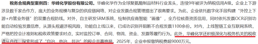 华峰化学积极深化与税务机关的税收遵从合作,探索形成了“自治、他治、共治”的税企共赢格局。