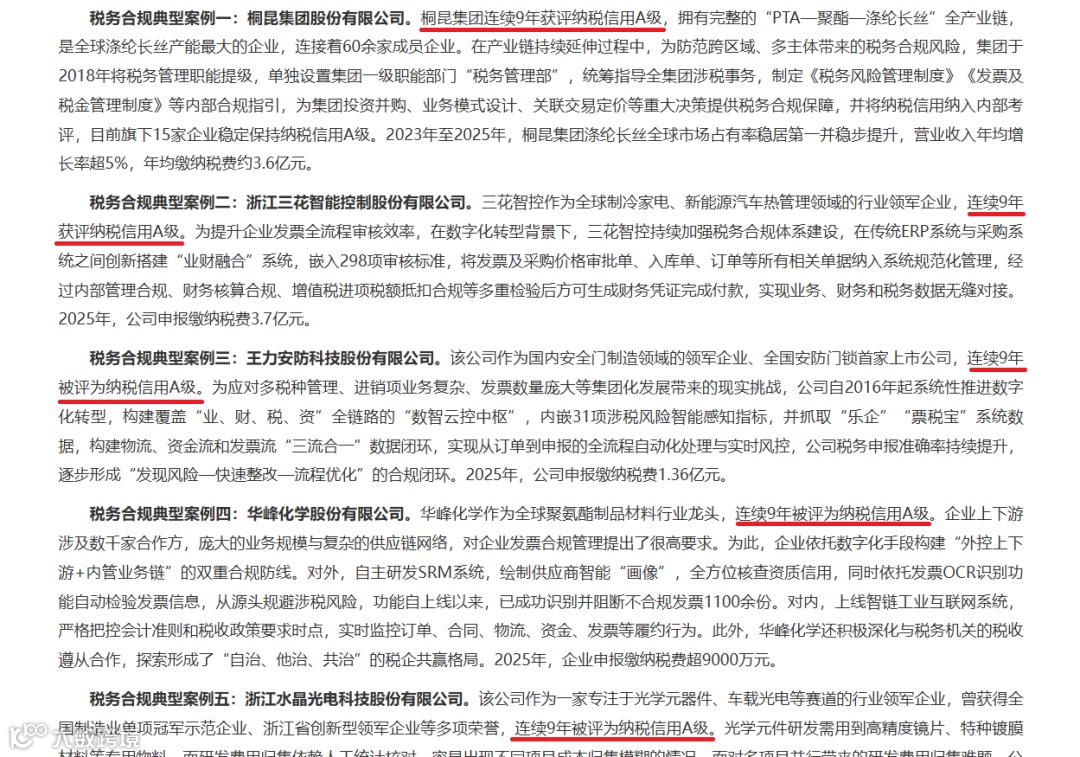 我们可以看出,桐昆集团、三花智控、王力安防、华峰化学、水晶光电——这五家企业都有一个共同的标签:连续9年获评纳税信用A级。