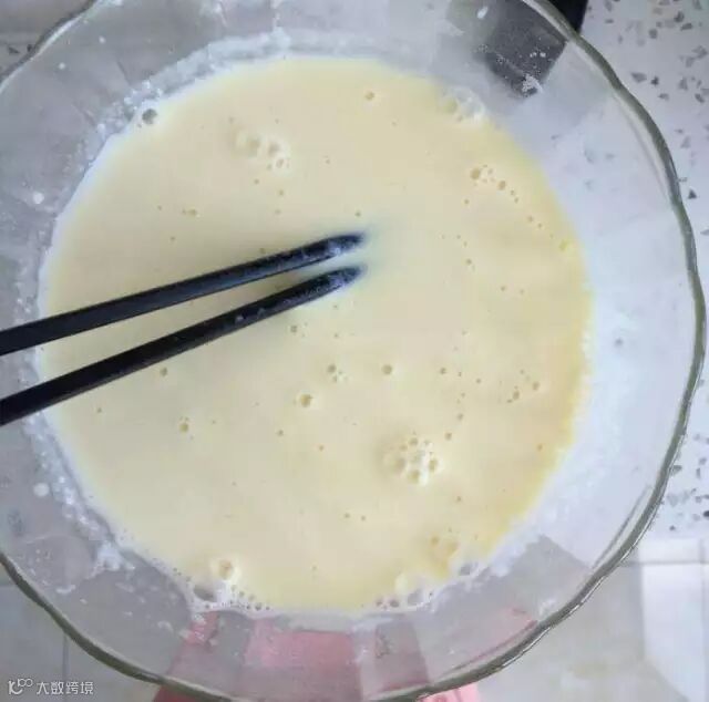 4、之前加热的奶放凉一些慢慢加入蛋液,一定要凉了要不蛋就熟了,把这两样再搅拌均匀再倒入锅里,小火,用勺子慢慢搅拌,要不然锅底该糊了。