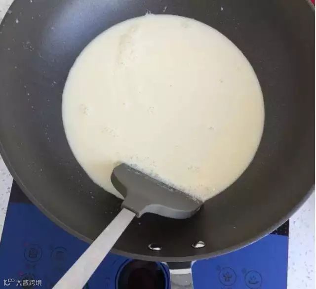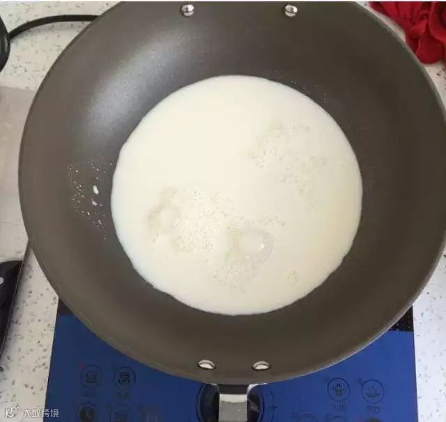 2、放锅里加热,一定要小火,奶冒泡就倒出来。