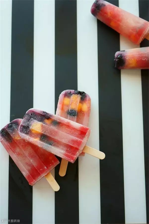 材料:蓝莓(煮酱)、蓝莓、西瓜(榨汁)、芒果(切块)、砂糖适量