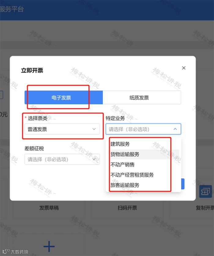 3、选择【立即开票】——【电子发票】,选择开票类型【增值税专用发票/普通发票】,并根据需要选择【特定业务】。如下图: