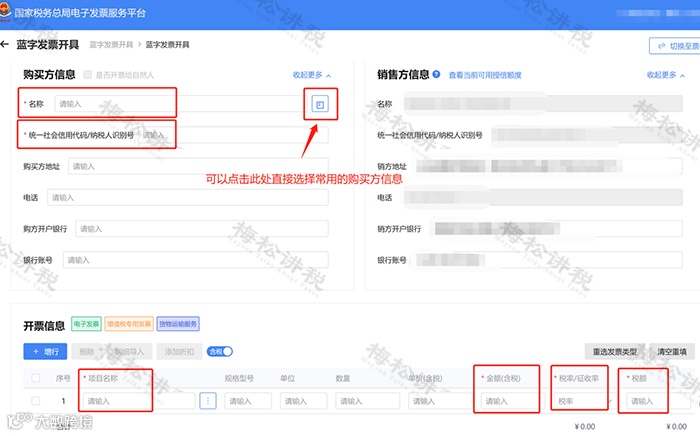 (1)填写【购买方信息】:开具增值税专用发票的,【名称】和【统一社会信用代码/纳税人识别号】为必填项;开具普通发票的,仅【名称】为必填项。