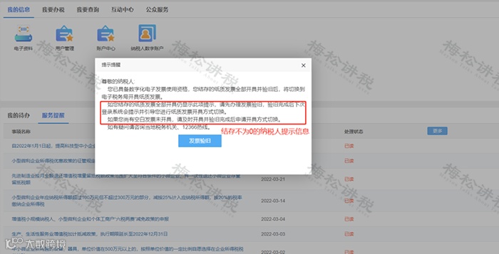 1.如果纳税人税控纸质发票结存为0,登录电子税务局后弹出以下提示:
