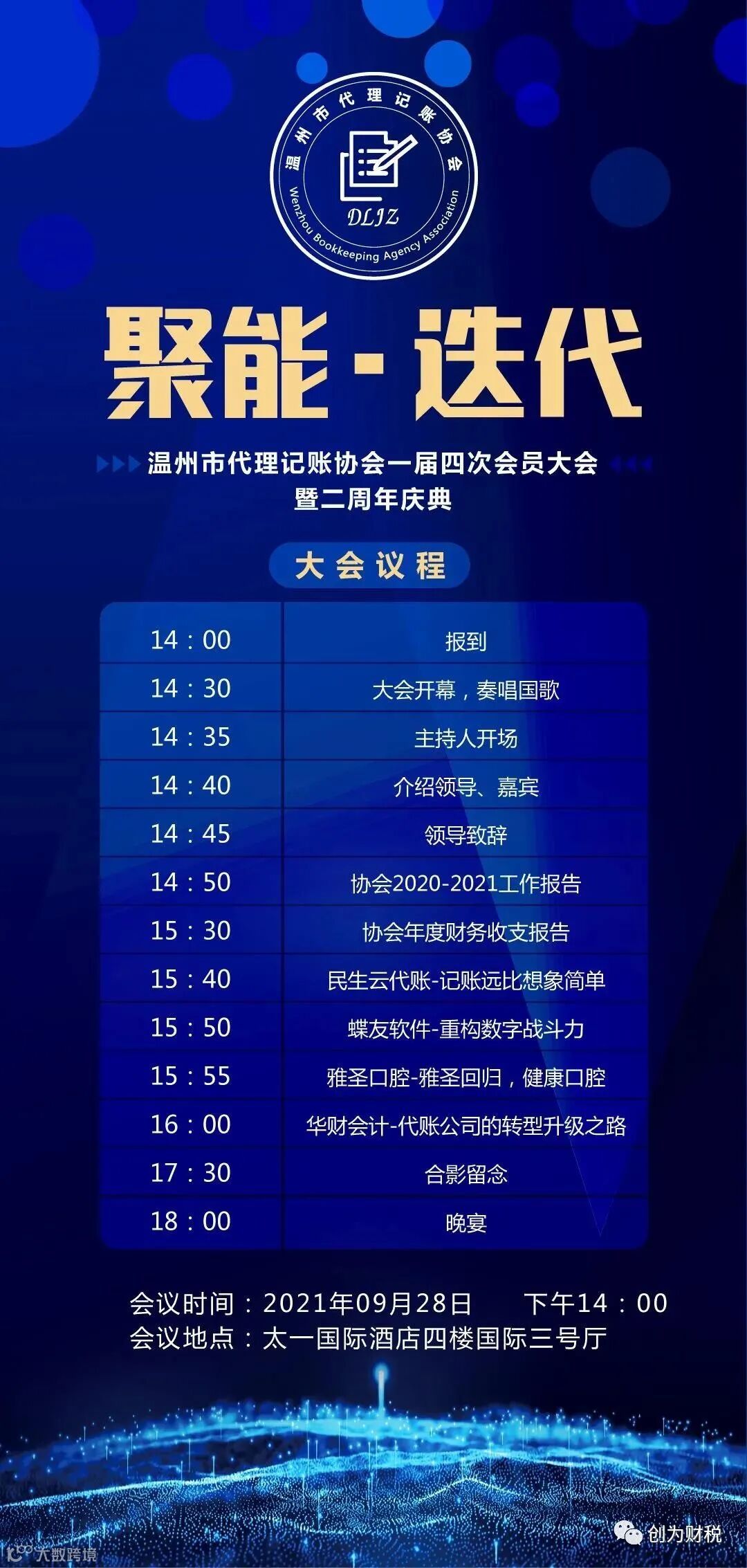 2021年9月28日下午,温州市代理记账协会一届四次会员大会暨二周年庆典在太一国际酒店召开,浙江创为财务管理有限公司作为温州市代理记账协会常务副会长单位受邀参加。
