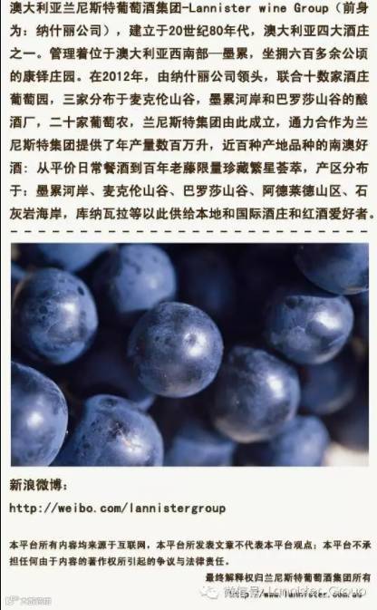 兰尼斯特红酒集团提供产自克莱尔山谷的雷司令和2012年麦克伦山谷老藤西拉子作为欢迎会唯一指定葡萄酒。