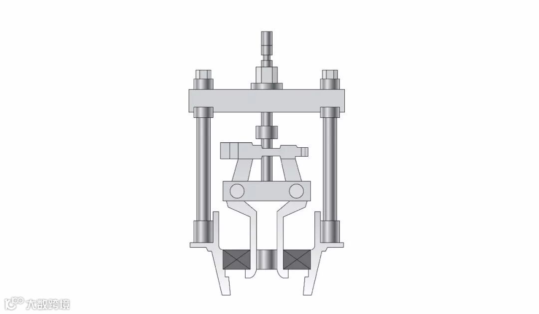 在轴承外圈有过盈配合的情形下拆除轴承的前提是外圈挡肩直径不能小于轴承要求的支撑直径,可以采用如下图所示的拉拔工具示意图来拆卸外圈。