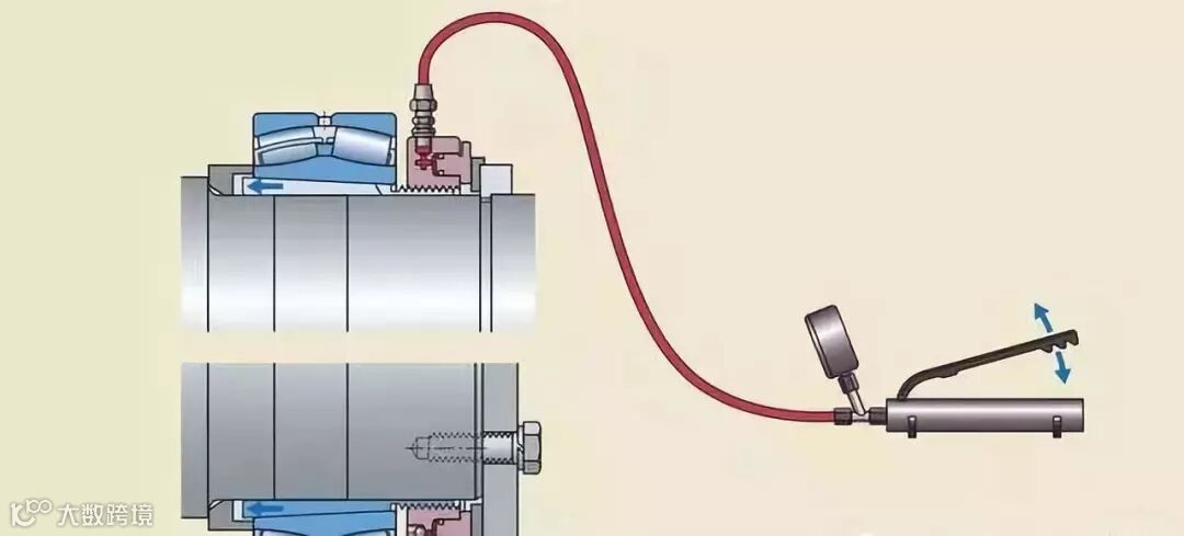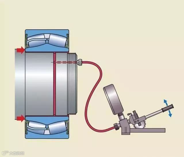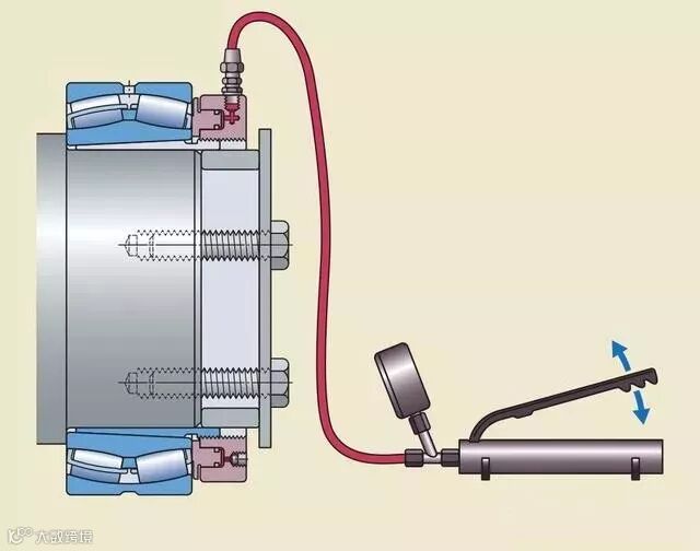当拆卸的力大到无法用普通方法拆除,且常规方法产生的拆卸力很可能损坏轴承时,一般会在轴的末端设计一个油孔,油孔延伸到轴承位置再径向贯通到轴表面,并加上一个环形槽,在拆卸时使用液压泵从轴端加压使内圈膨胀,减少拆卸力。