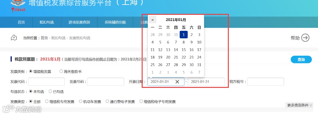 购方企业在综服平台上选择合适的税款所属期,即让税款所属期的设置区间包含开票月份,再对该电子专票进行勾选。