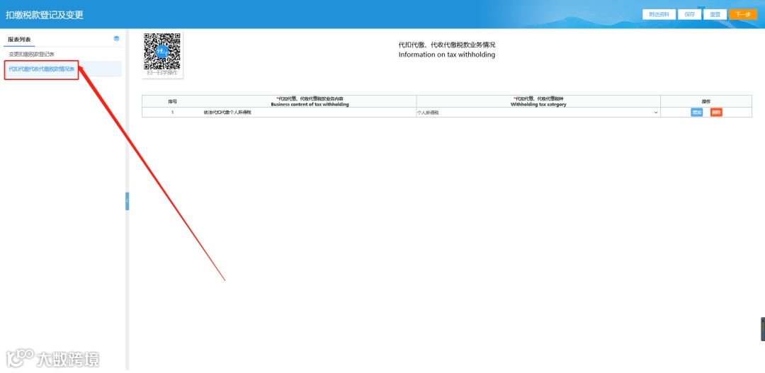 答:请通过电子税务局【我要办税】—【综合信息报告】—【身份信息报告】—【变更扣缴税款登记】,点击“代扣代缴代收代缴税款情况表”,查看是否有代扣代缴企业所得税。如果没有,请在电子税务局【我要办税】—【综合信息报告】—【税(费)种认定】,申请添加“代扣代缴企业所得税”,在“备注栏”注明需添加的具体税种及有效期。