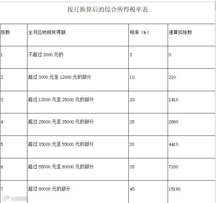 图2:按月换算后的综合所得税税率表。图片来源:国家税务总局
