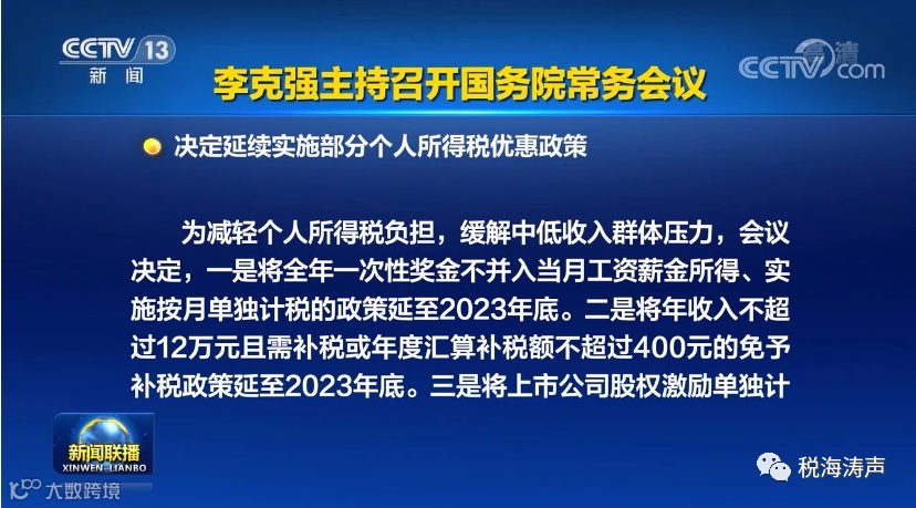 据央视新闻联播,12月29日,国务院总理李克强主持召开国务院常务会议,决定延续实施部分个人所得税优惠政策。