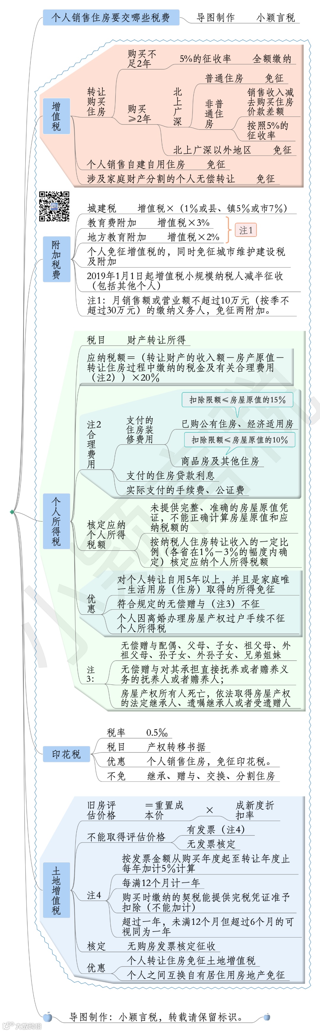根据《营业税改征增值税试点过渡政策的规定》(财税〔2016〕36号附件3)规定, 如果该住房持有满两年,免增值税及附加;如果不满两年,增值税 5%、城建税 7%(市区)、教育费附加3%、地方教育费附加 2%。 根据《国家税务总局关于增值税小规模纳税人地方税种和相关附加减征政策有关征管问题的公告》(国家税务总局公告2019年第5号),小规模纳税人城建税及附加享受减半优惠。