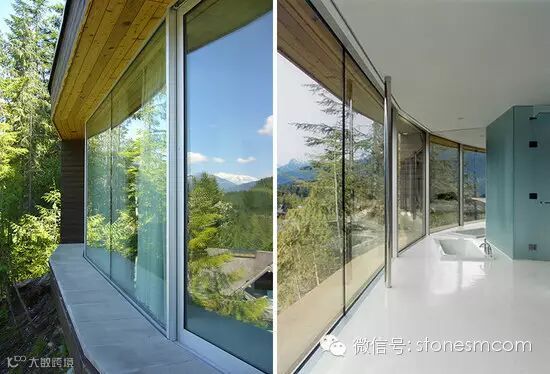 (左图)主卧室外:向外凸出以最大化景观视野范围,同时为其他卧室提供私密性。(右图)主盥洗室