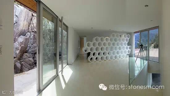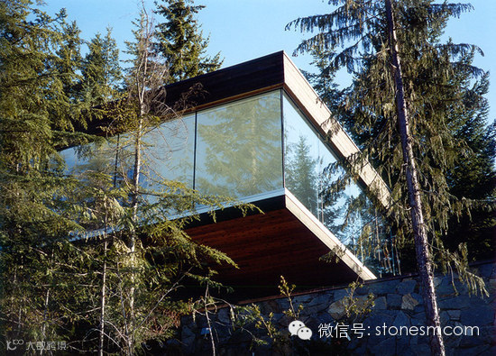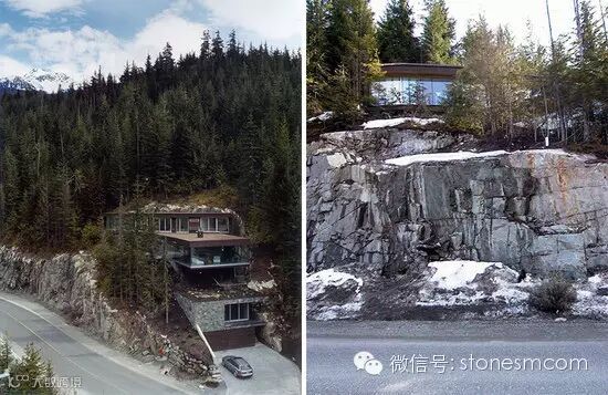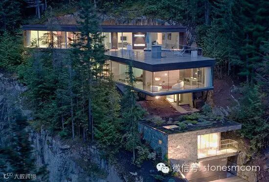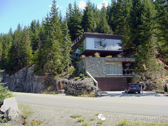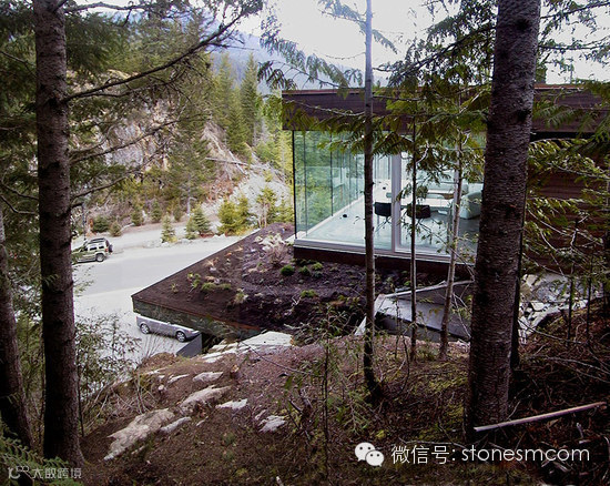本住宅项目的委托人是一位狂热的滑雪运动爱好者, 加拿大 NminusOne 设计事务所将住宅设计在山边建造,刚好与委托人的兴趣爱好的相统一。“开伯尔(khyber)山脊住宅”位于在山崖的一侧,与公路相邻,四周有茂盛的林木环绕。住宅共有5层,户主不断进出于山崖间,仿佛是一次不会结束的旅行。位于首层的车库支撑着上方的客房,客房的石材外表,以及环境相融的绿化屋顶,仿佛其与高山融为一体,最大化了私密性。楼梯(首层楼梯位于室外,剩余楼层楼梯全部位于室内)依附裸岩表面而建,这样山体就可以作为楼梯的另一面墙。上面一层是以玻璃围合的起居室、餐厅以及厨房,这部分空间悬挑于下层的绿化屋顶之外,拥有更好的观景效果。直接嵌入山岩3英尺的长条型钢梁使得该部分体量仿佛漂浮于地面之上。顶层是主卧和另外两间卧室,他们拥有整栋房子最好的景观视野范围,这也得益于下层的起居室,为卧室提供了一个宽敞的室外露台。