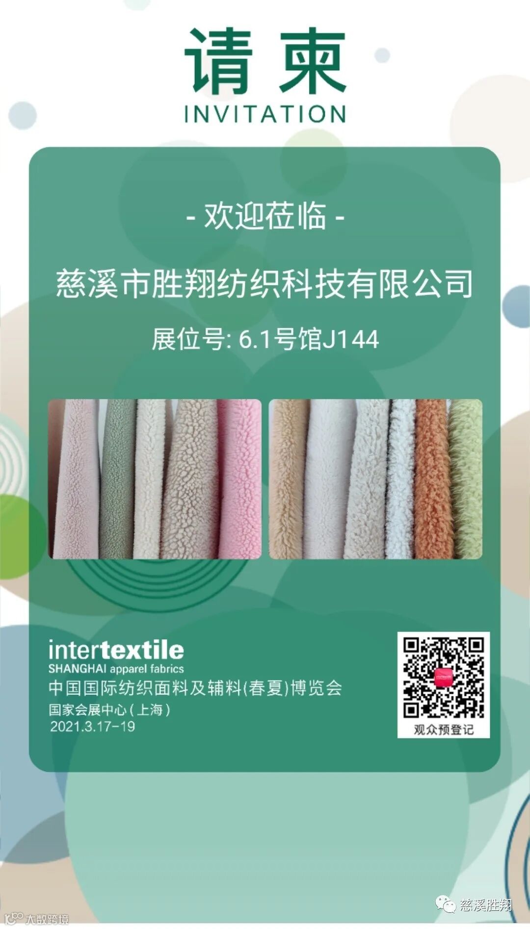 导读:春风已至,三月可期!慈溪市胜翔纺织科技有限公司诚挚邀请新老客户莅临国家会展中心(上海)6.1号馆 J144选样。