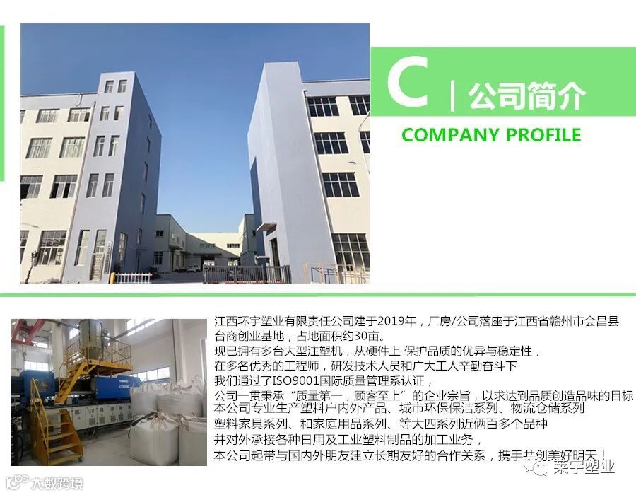 公司专业生产塑料户内外塑料家具、垃圾桶、水桶、周转箱、塑料日用品等五大系列近俩百多个品种,并对外承接各种日用及工业用塑料制品的加工业务。