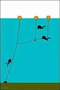 明明没多久前还是15米的深度,一会一抬头就看见波光粼粼的水面了。这里有几个要领希望掌握:经常检查自己的潜水电脑表或者深度计,最快速直观地明确所处的位置。再是观察潜伴和潜导相对的位置,我们的潜伴制度的优势要得以体现。其次是观察,深度产生的光线强弱,热带水域还有水面水底温度差的变化,气泡由于不同流向的改变,水下生物和植物的相对位置,总之找到可靠的参考物,根据经验来有效判断非常重要。