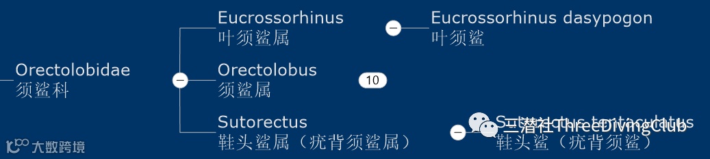Orectolobidae须鲨科下三属,其中叶须鲨属和鞋头鲨属(疣背须鲨属)各有一物种。
